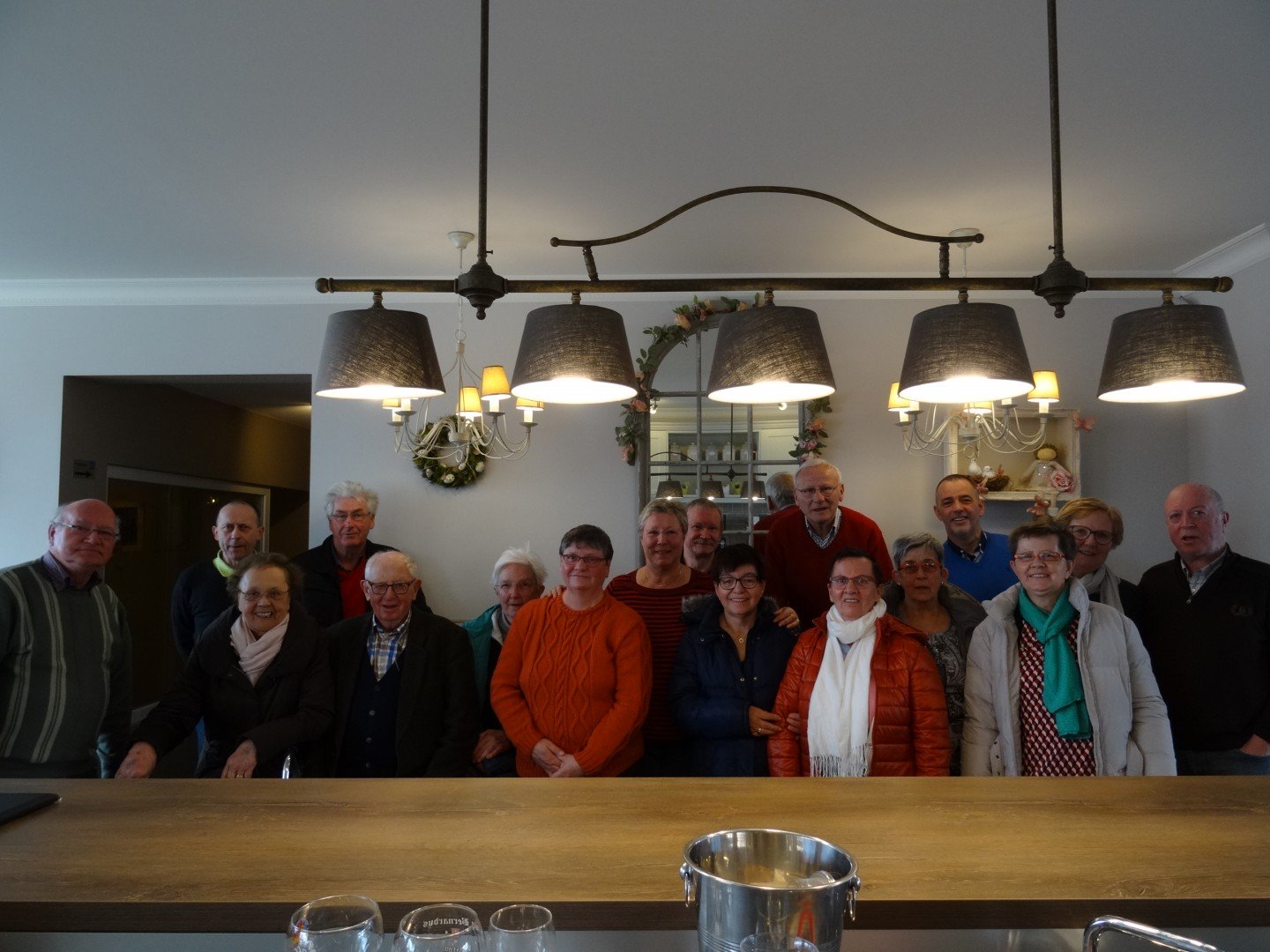 Met paraplu in de hand starten we met 14 leden de korte 6 km versie van de Willy Spillebeenroute, maar blijven gelukkig van regen gespaard. Ter info: Spillebeen werd geboren in 1932 op de ouderlijke hoeve in Westrozebeke. Zijn literaire carrière begon pas in Menen, waar hij nu nog woont. Hij schreef vooral romans, verhalen en vertalingen. Hij vertaalde o.a. heel wat gedichten van de Chileense dichter en nobelprijswinnaar Pablo Neruda. We passeren de St-Bavo (bedevaarts)kerk, hoeve Ter Keuneleute, het geboortehuis van Spillebeen, en het Keuneleutebosje en genieten van mooie panorama's en landelijke taferelen die zich op de akkers afspelen (uitvoeren van drijfmest!) en van de contacten tijdens onze tocht. In het 'Stuttekot' wachten Eugène en Beatrijs ons om 16.15 op. Bij een drankje genieten we van een verdiend rustmoment. Anny die onlangs oma geworden is, trakteert ons op doopsuiker van haar eerste kleinkind. Met dan aan de fotografe van dienst, Noëlla.